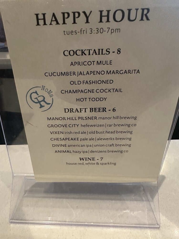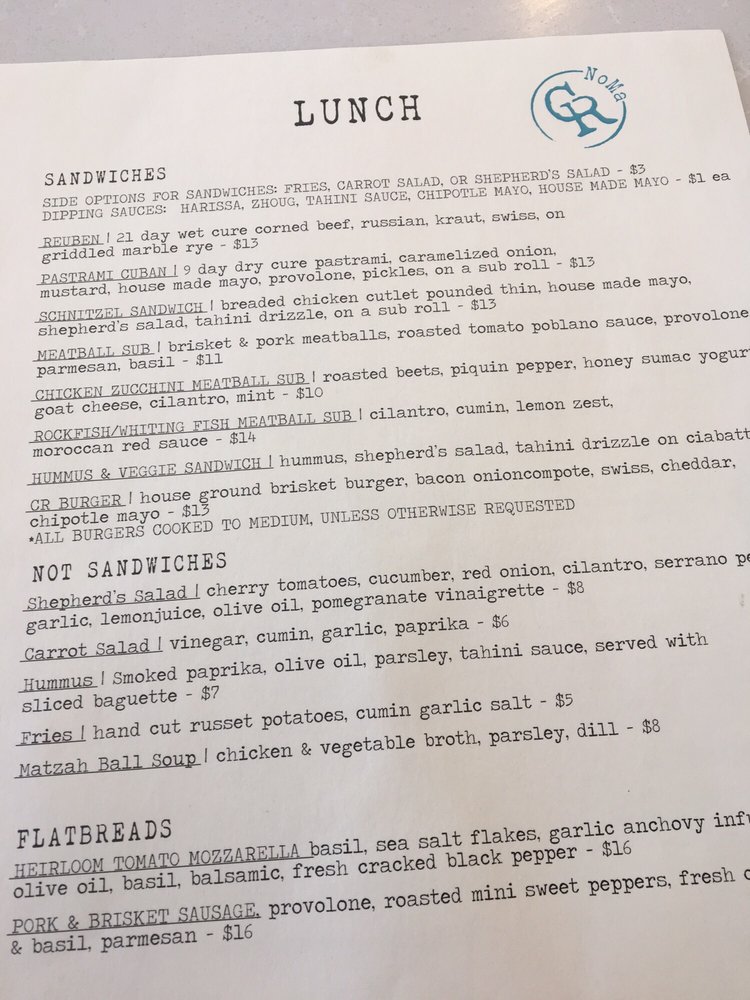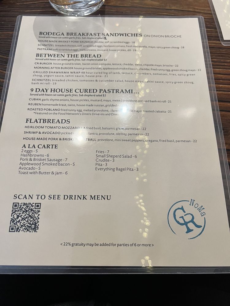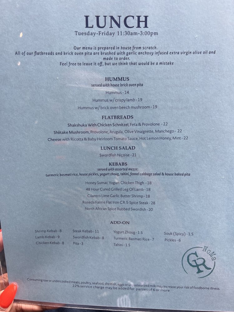 CR NoMa, a Mediterranean cocktail bar in Washington, DC, offers a diverse menu from small bites to brunch options. The menu features unique dishes like Hummus with crispy lamb and Matzah Ball Soup. Customers rave about the exceptional food and friendly service, making it a go-to spot for many. The cozy ambiance with twinkling lights and modern decor adds to the overall dining experience. With a variety of options for vegetarians and non-vegetarians alike, CR NoMa caters to a wide range of preferences. The restaurant's commitment to quality and innovation shines through in dishes like the Classic Cigars and French Toast. Overall, CR NoMa provides a delightful dining experience with a touch of Mediterranean charm.